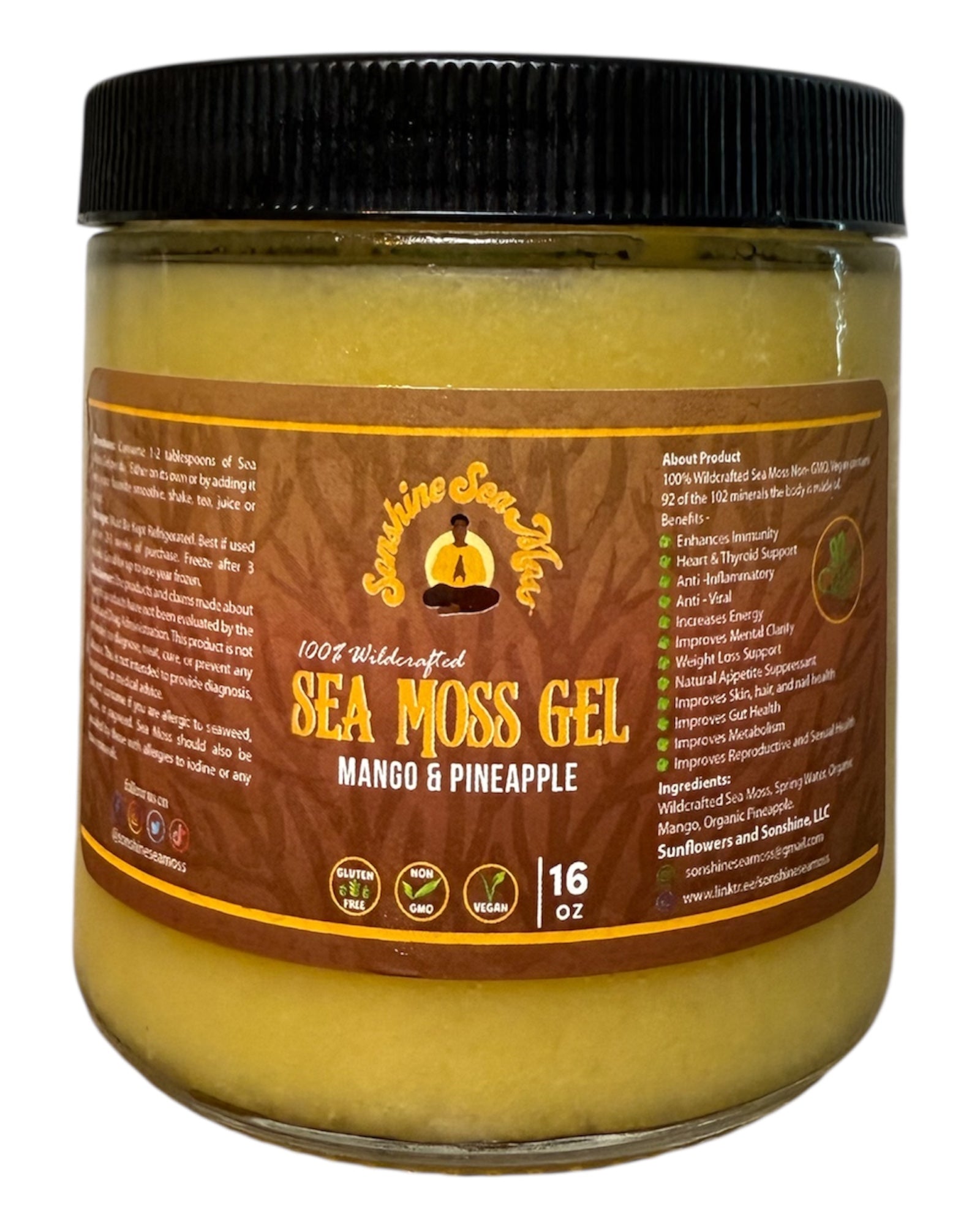 At Sonshine Sea Moss, we use 100% wildcrafted golden and Irish sea moss from the clean waters of St. Lucia, combined with organic fruits, agave, and spring water! Yes! That is it! We do not use artificial preservatives, toxins, or synthetic chemicals.